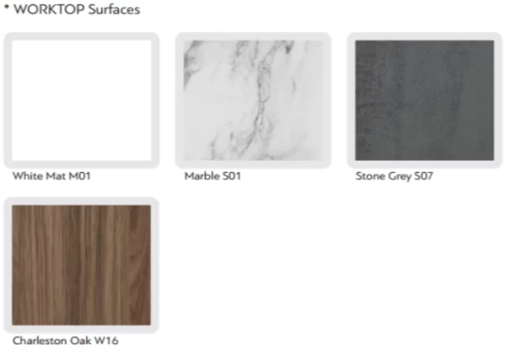 Basi e colonne: In MDF verde inassorbente all' aqua 18mm Laccato opaco o lucido Cassetti: Struttura in metallo con sistema Sof Close Ante: Con chiusura Sof Close Maniglia: Effetto gola Top: In MDF rivestito Thermofoil PVC Colori: Top: Worktop*. Basi: Laccato in fnitura opaca o lucida Lavabo: ELOISE o da Appoggio